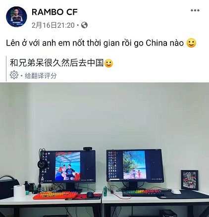 最近,CFS2021世界赛殿军选手,越南职业选手RAMBO在社交平台上发文,声称自己将和自己的兄弟待一段时间然后启程出发去中国。这样的一条社交发文让不少玩家充满了好奇,作为越南的在役职业选手,RAMBO的实力可以在越南地区排进前三。在越南CF赛事圈中也拥有着举足轻重的地位,这样的一条发文更是引来了不少玩家的评论: